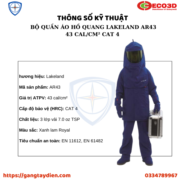 THÔNG SỐ KỸ THUẬT BỘ QUẦN ÁO HỒ QUANG LAKELAND AR43 43 CAL/CM² CAT 4